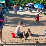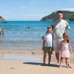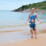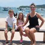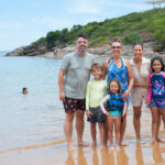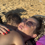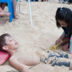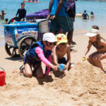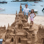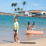 O Vini fez um castelo bem grande na beira da praia e a Antônia ficou andando de prancha com a Tati puxando ela.