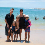 Chegando em casa, fui com as crianças na praia da areia preta pois queriam pegar um pouco da areia preta para levar embora. enquanto as meninas pegavam, o Vini achou um casal que estava jogando altinha e jogou junto. Ainda tomou banho de mar com eles depois.
