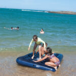 O Vini quis alugar um colchão para brincar no mar, o problema era o vento mais forte que ele. Não conseguiu ficar nem 5 minutos e saiu voando. O colchão foi parar lá na outra praia, não sei se não furou neste momento. Acabamos devolvendo e podendo usar de crédito outro dia.