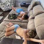 O Vini, que dormiu na sala, acordou depois das 9h mesmo com o barulho, calor e a claridade, acho que estava cansado. A Isis, que dormiu junto com ele acordou e foi para a nossa cama as 3h30.